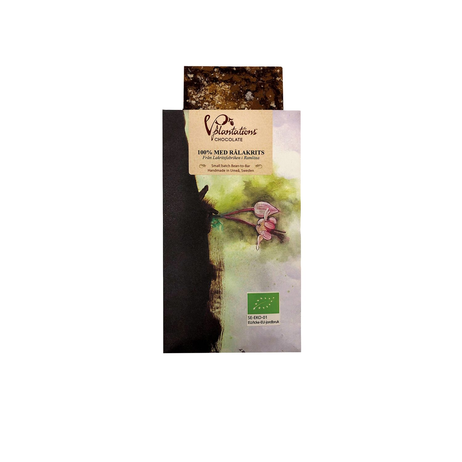 Ingredienser: *Stenmalda kakaobönor, *kakaosmör, *rålakrits, *lakritspulver, havssalt.