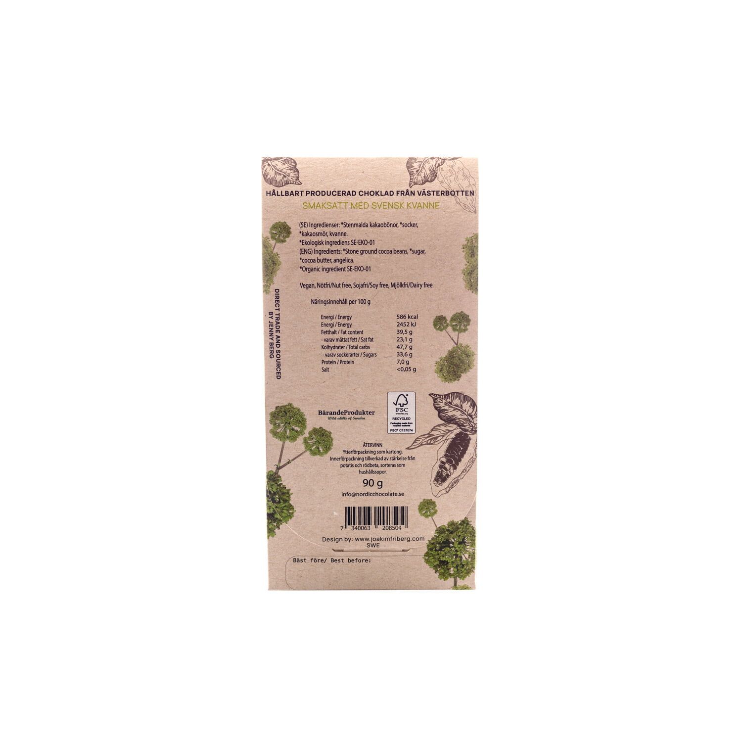 Genom vår choklad vill vi visa på det rika kulturarvet i Västerbotten. Fjällkvanne har traditionellt använts för både medicinska ändamål och som smaksättare. Vår kvanne som växer under midnattssolen i Västerbottens fjälltrakter plockas och torkas lokalt av BärandeProdukter. Vi smaksätter chokladen med kvannen och lägger även några frön ovanpå kakan att tugga på för dess rika kryddiga smak.