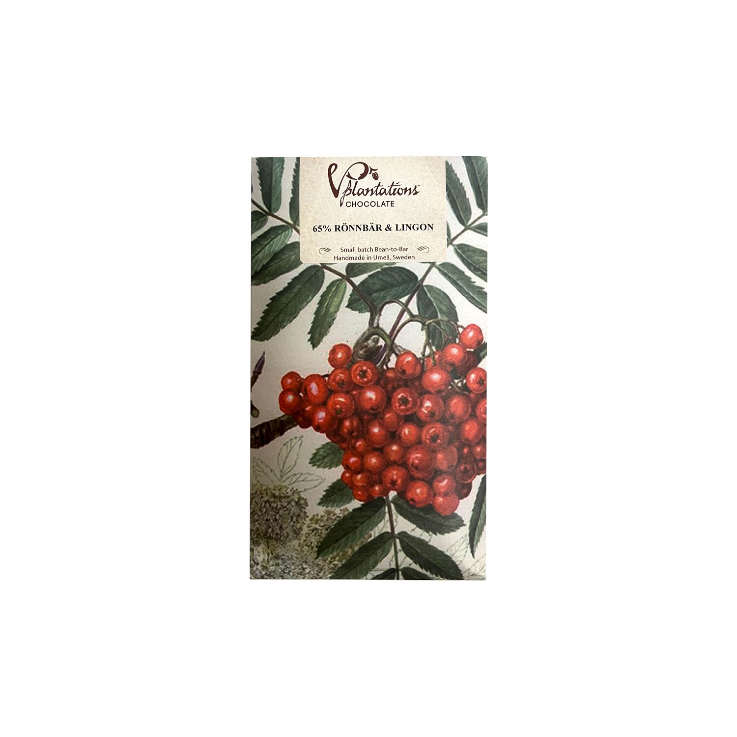 En unik choklad med svenska rönnbär och lingon där rönnbären, med sin naturliga syra och lätta beska, förenas förnämligt med de sötsyrliga lingonen i den mörka chokladen.